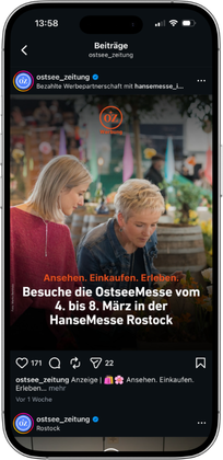 Profitieren Sie dabei von der hohen Glaubwürdigkeit, dem redaktionellen Umfeld und der Reichweite der Social-Media-Kanäle der OSTSEE-ZEITUNG. Ideal für Ihre Imagewerbung (Ziel: Bekanntheit), um möglichst viele Menschen zu erreichen, im Gedächtnis zu bleiben oder um Klicks auf Ihre Webseite (Ziel: Traffic) zu generieren.