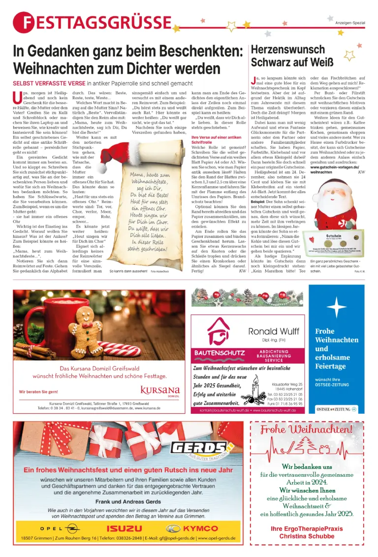 30 % Rabatt auf eine Anzeige in der Sonderveröffentlichung Festtagsgrüße und 50 % Rabatt auf eine 2. Anzeige in gleicher Größe bei Veröffentlichung im Januar 2025.