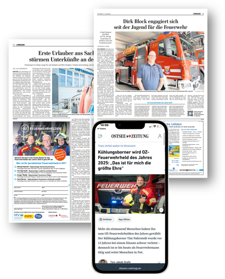 Die OSTSEE-ZEITUNG startet 2026 bereits zum dritten Mal die landesweite Aktion „Feuerwehrheld in MV gesucht“. Die ersten beiden Ausgaben des Wettbewerbs waren ein großer Erfolg: Allein im vergangenen Jahr beteiligten sich 8.510 Menschen an der Abstimmung. Die 31 themenbezogenen Artikel aus 2025 erzielten 120.021 Seitenaufrufe, und 150 Gäste nahmen an der feierlichen Siegerehrung auf dem Feuerwehrfest in Kühlungsborn teil.